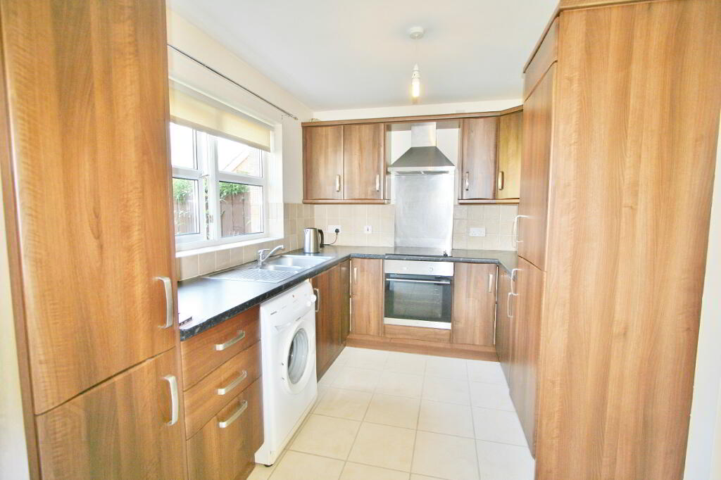 17'11" x (5.46m ) x 11'7" ( 3.45m) Full range of high and low level Walnut units with contrasting worktops. 1 1/2 bowl stainless steel sink unit with mixer taps. Tiled splash Back Area. Integrated 4 ring hob with stainless steel splash back and stainless steel overhead extractor fan. Low level combination oven and grill. Integrated Fridge / Freezer . Plumbed for Washing Machine. Fully tiled floor. PVC Double Glazed patio door leading to rear garden.