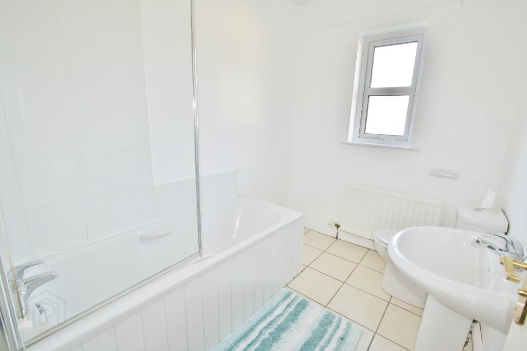 Bathroom 8'3" (2.51m) x 6'2" (1.88m) Modern White bathroom suite comprising of low flush WC, Panelled bath with monobloc mixer taps , thermostatic shower unit above , Glazed shower screen. Pedestal wash hand basin with monobloc taps. Tiled splash back . Partially tiled walls to bath area. Extractor Fan. Tiled floor.