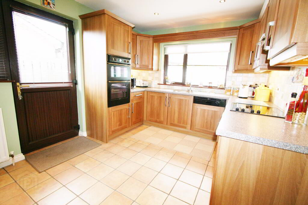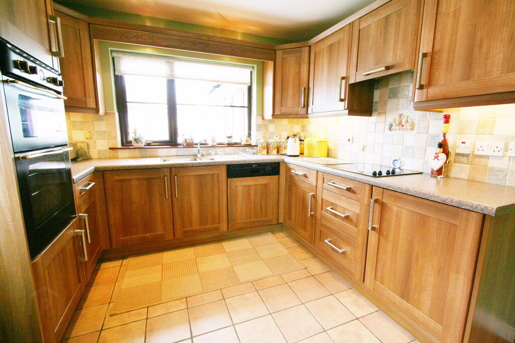 Full range of high & low level units. Non Scratch formica worktops. Part tiled walls. 1 1/2 Stainless steel drainer and mixer taps. Tiled splash back area , plumbed for dishwasher . Floresecnt strip lighting , ceramic tiled floor, extractor fan/canopy , integrated fridge , integrated cermaic hob and oven. Access to rear.