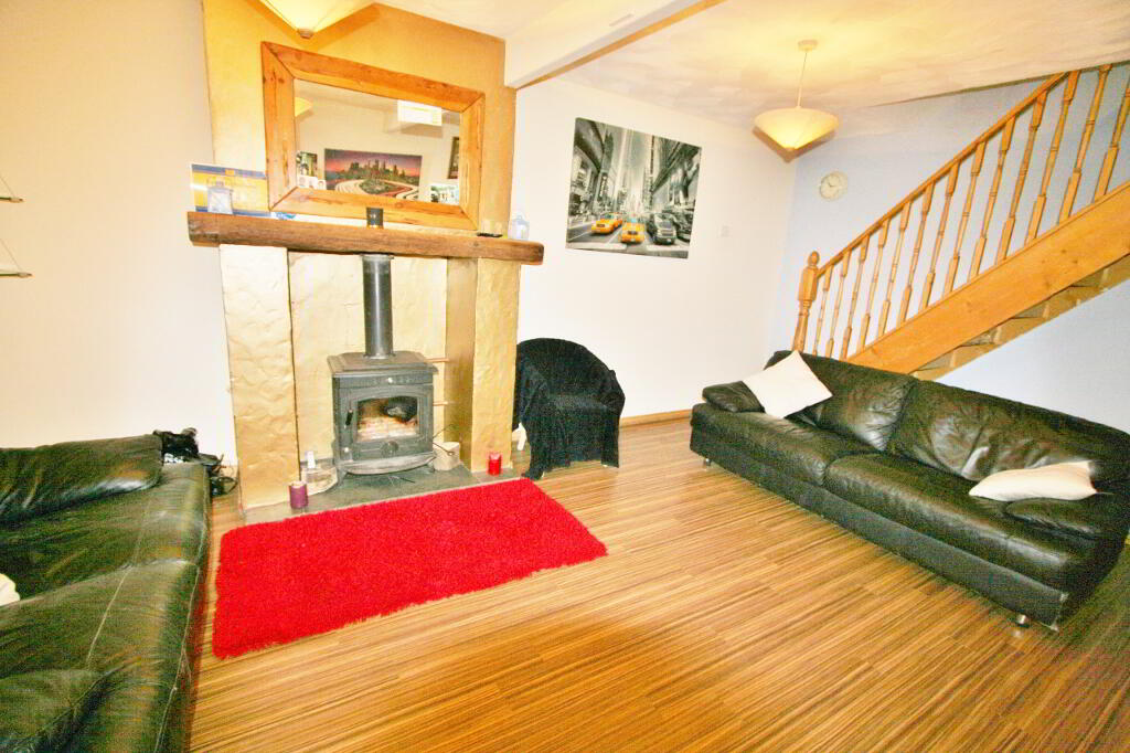 Feature multi fuel stove with back boiler. Tiled hearth. Laminated wooden floor.