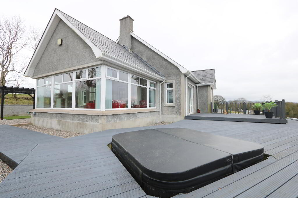 GROUNDS EXTENDING TO OVER AN ACRE WITH PATIO AREAS, LAWNED GARDENS AND DECK WITH HOT TUB