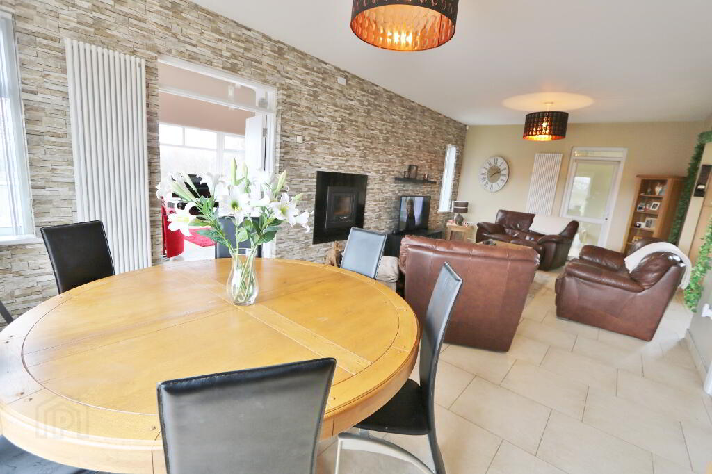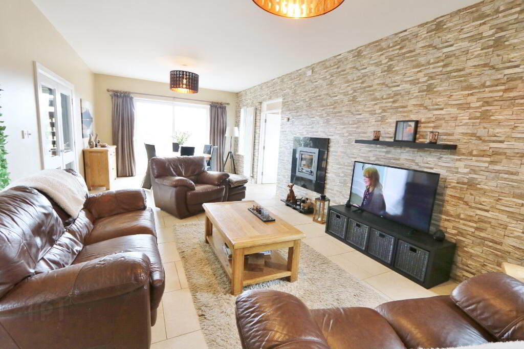 Glass fronted fire. Patio doors to decking . Open plan to Kitchen
