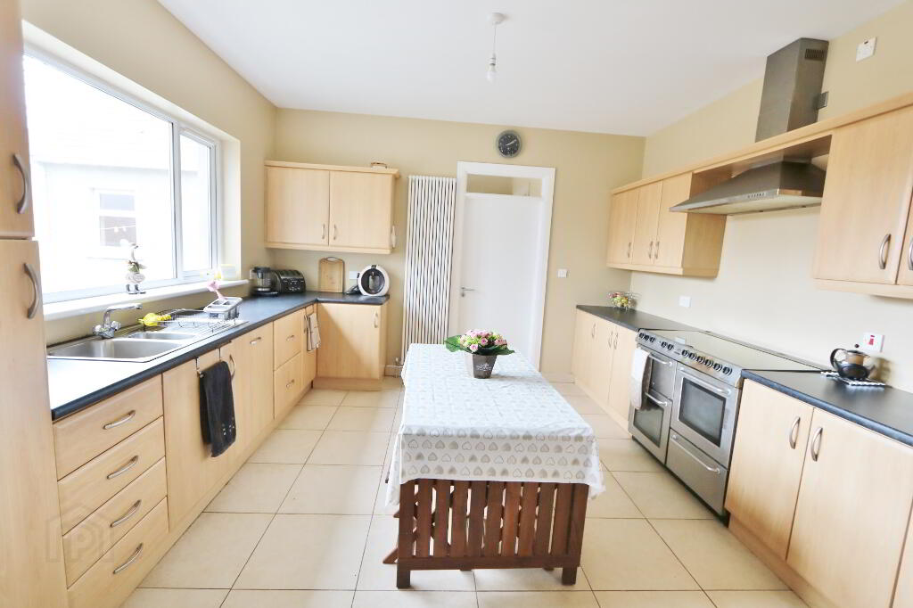Full range of high and low level Beech units with non scratch formica worktops. Plumed for dishwasher. Stainless steel sink unit with mixer taps. Tiled splash back. Integrated Fridge.