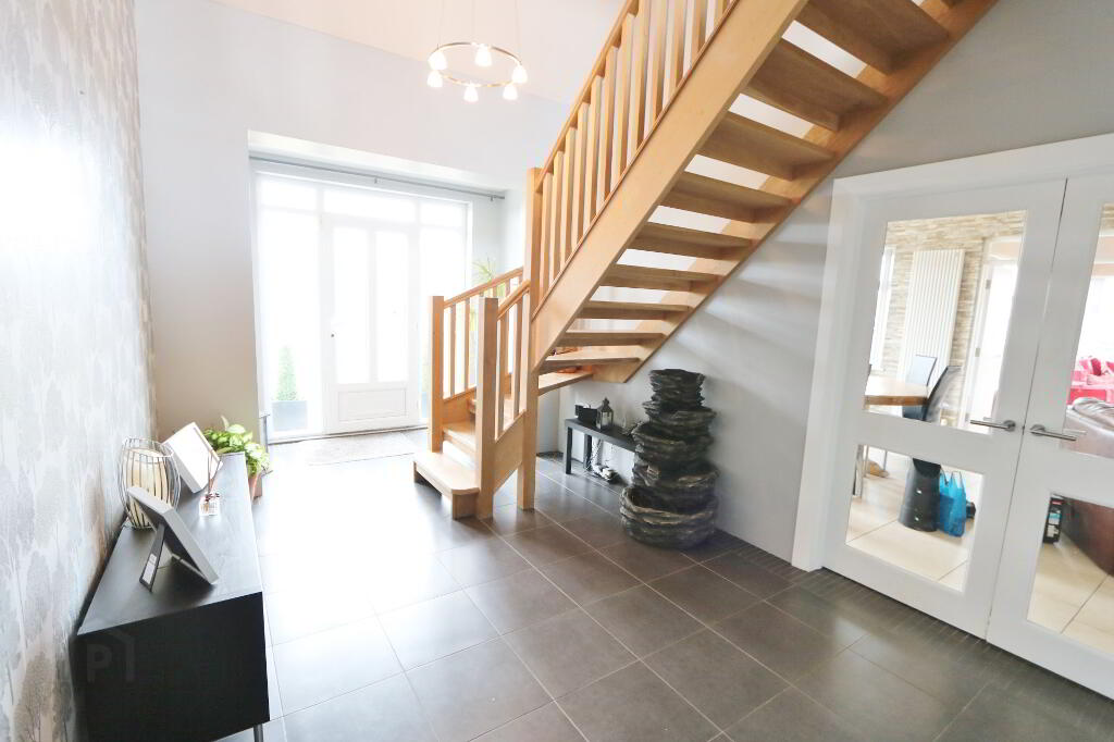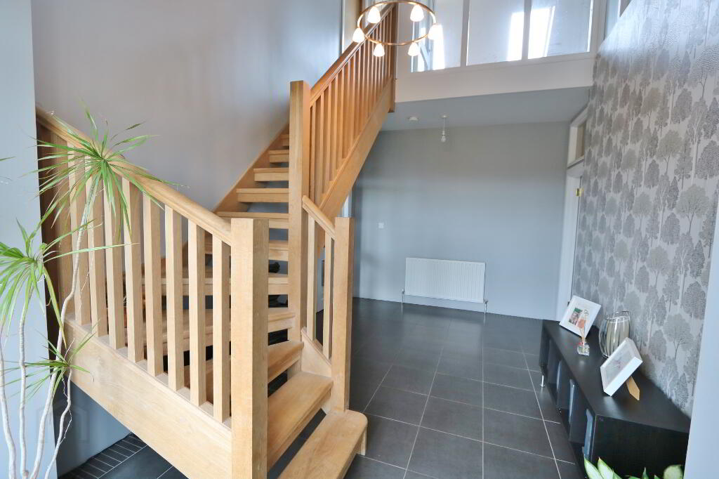 PVC front door with glazed side screen. Telephone point. Modern Oak Turned Staircase with Oak balustrades leading up to entertainment area.