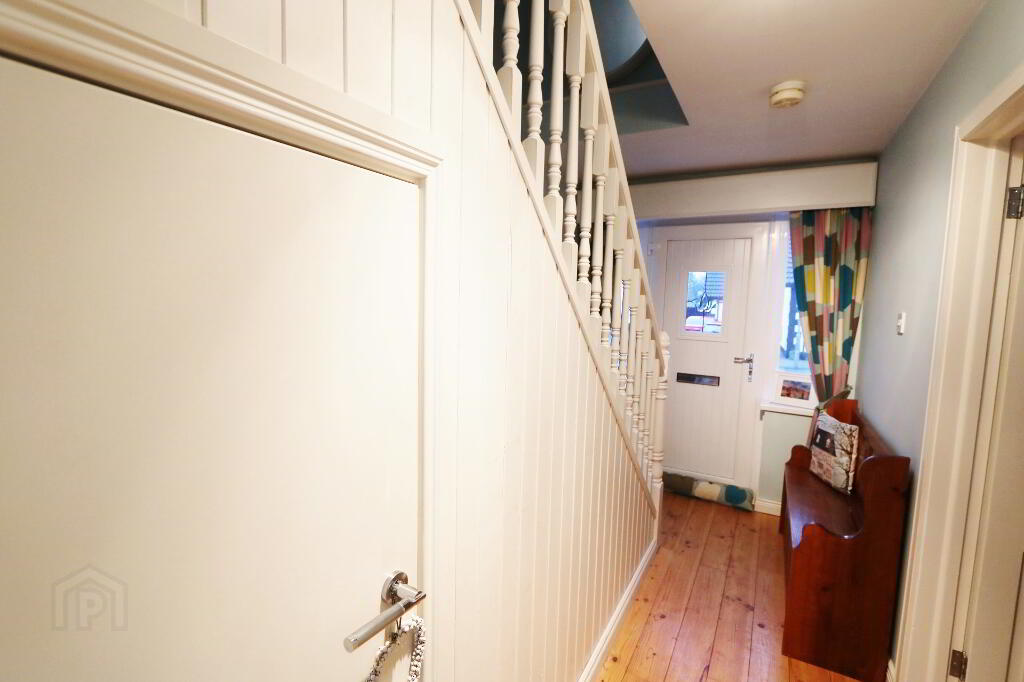 PVC Front door with Glazed side screen, tel point, pine wooden floor, storage cupboard. Staircase leading to first floor.