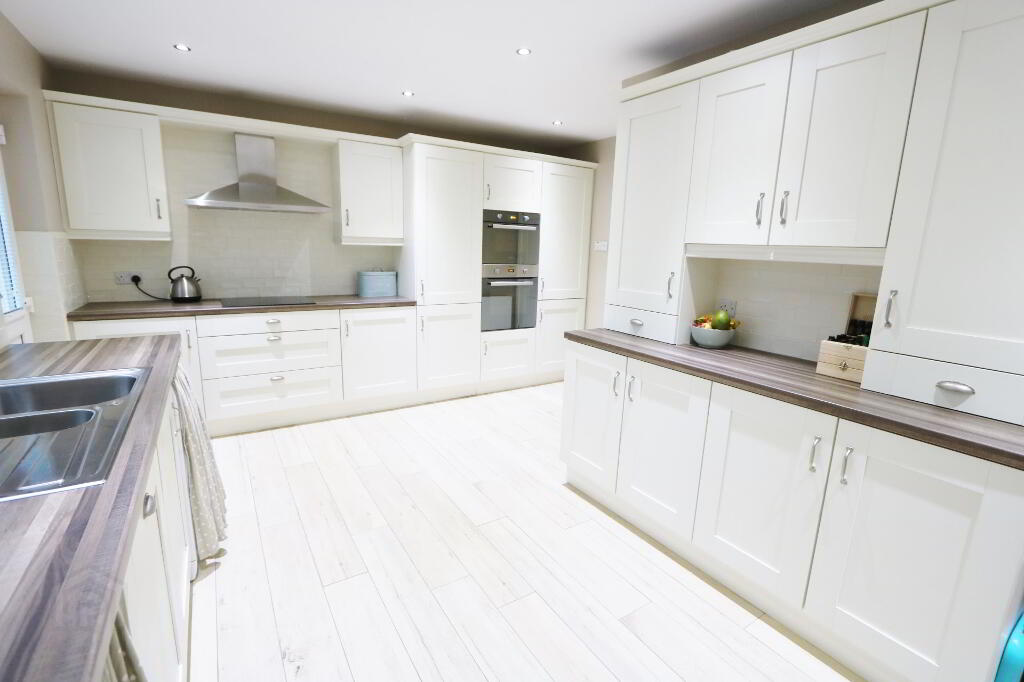 Modern fitted kitchen with a range of high and low level units. Wood effect worktops. Part tiled walls. Plumbed for washing machine, dryer, dishwasher. Stainless steel sink with mixer taps. Extractor fan with stainless steel canopy. Integrated microwave and oven, ceramic hob. Wood effect tiling on floor.