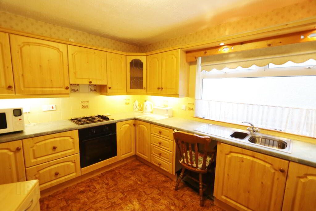 Full range of high and low level units in pine. Non scratch formica worktops. Part tiled walls. Plumbed for washing machine. 1.5 Stainless steel sink and mixer taps. Tiled splash back area. Extractor fan canopy. Pelmet lightening.