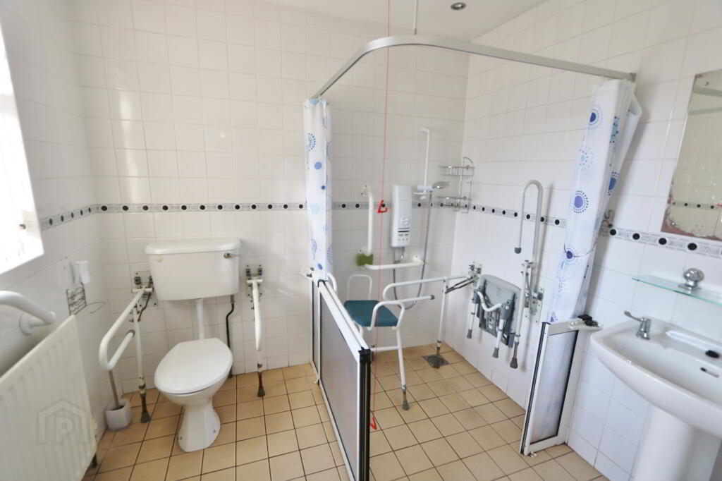Low flush WC, Pedestal Wash hand basin, Shower with screen. Fully tiled walls. Tiled Floor.