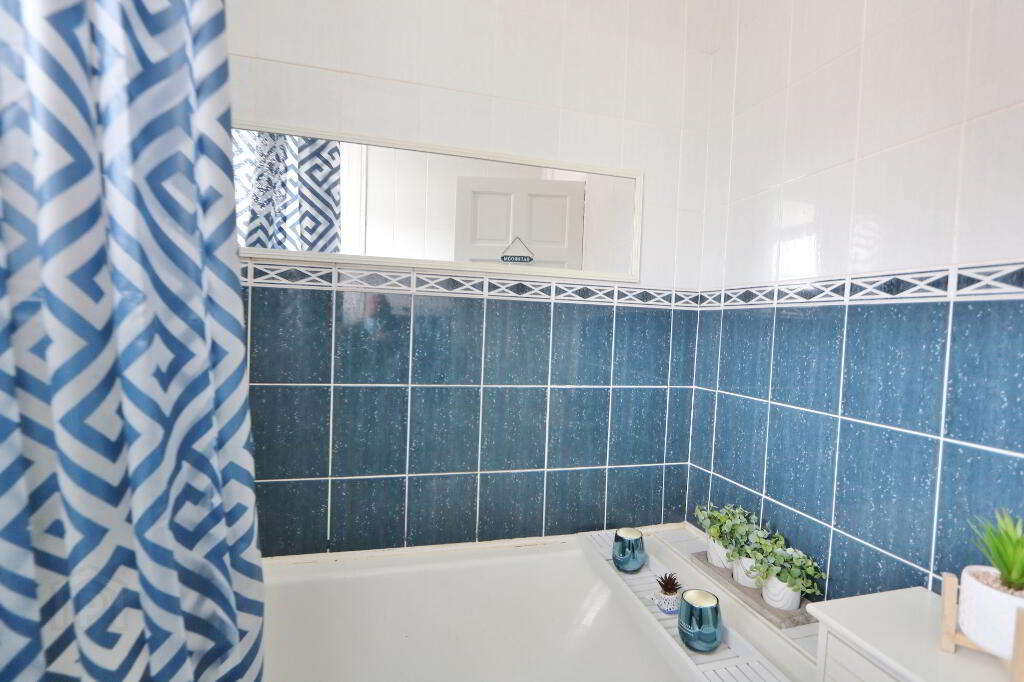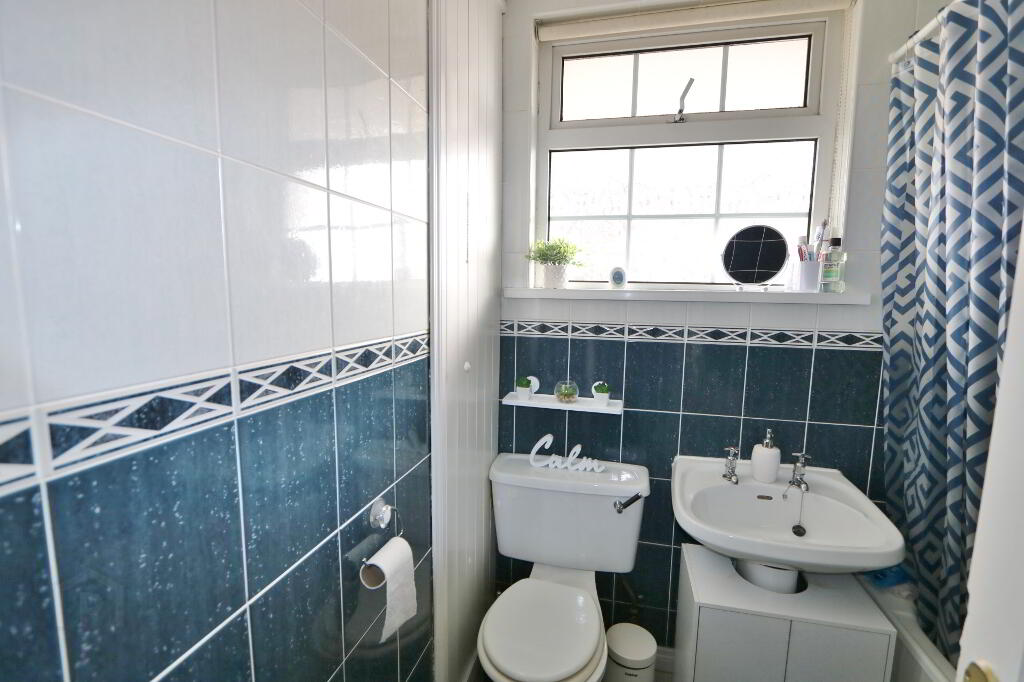 White bathroom suite Panelled bath with shower over - Shower curtain. Part tiled walls -
