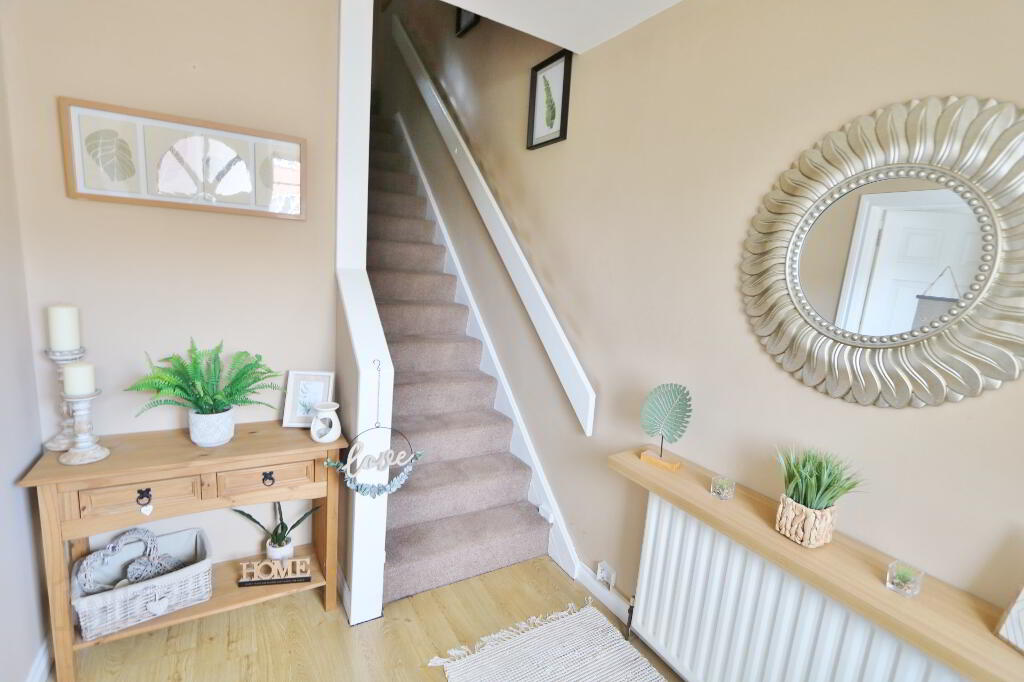 Front door with glazed , Laminated wooden floor , Telephone point Staircase to first floor-