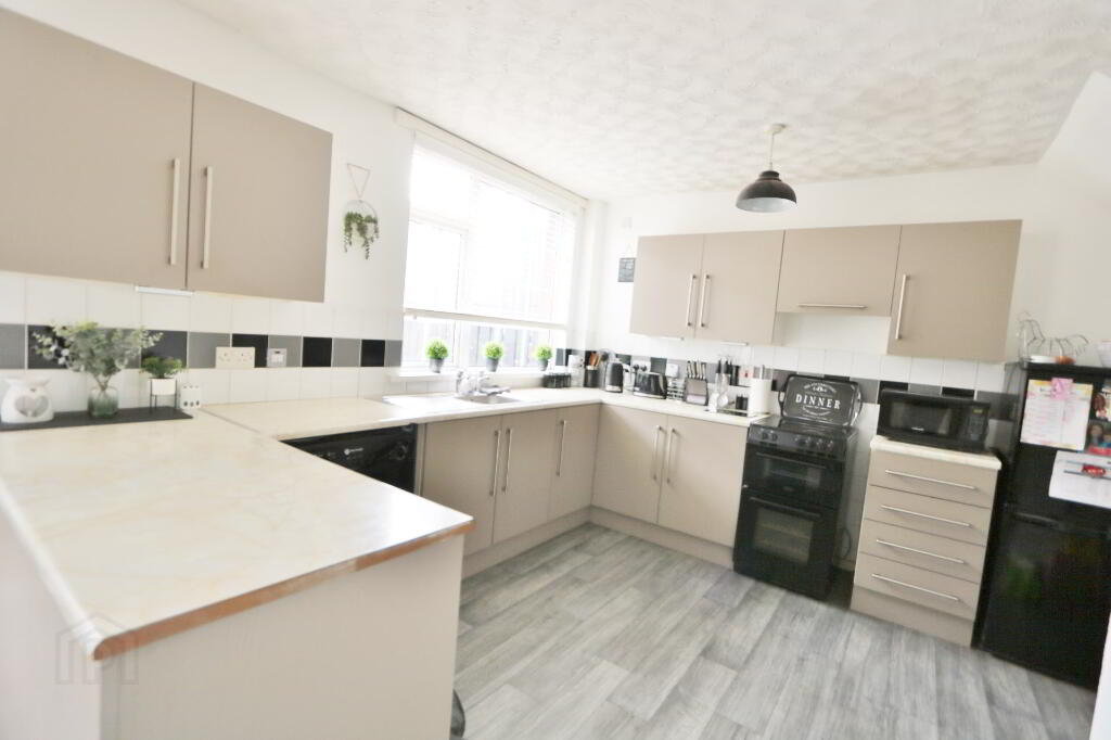 Full range of units with contrasting worktops- Part tiled walls. Stainless steel sink unit with mixer taps - Laminated wood effect floor- Door leading to rear garden -